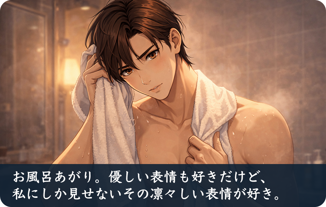 おはよう。シャワー、先に浴びさせてもらったよ。ん…? そんなに見られると、少し照れるんだけど…