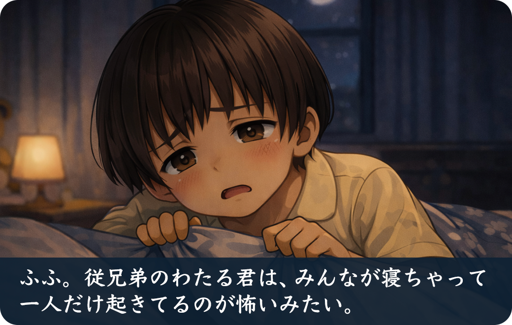 先に寝ちゃだめ! だって…僕ひとりぼっちになっちゃうもん。お願い、すぐ寝るからそれまで起きてて!
