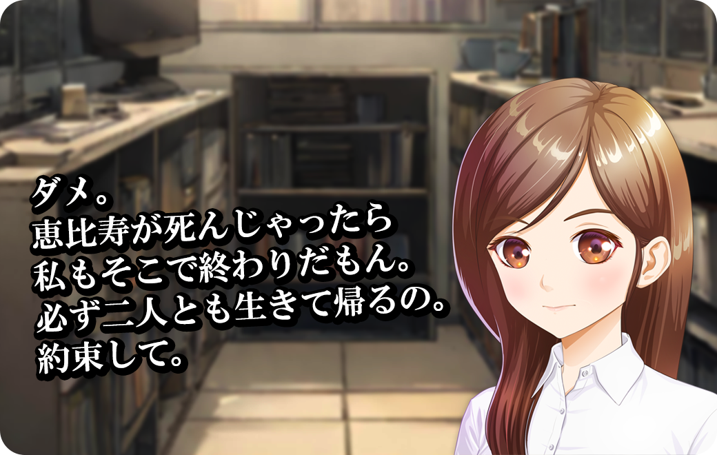 ダメ。恵比寿が死んじゃったら私もそこで終わりだもん。必ず二人とも生きて帰るの。約束して。