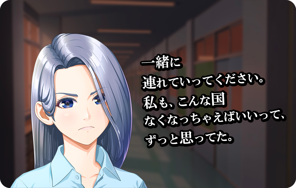 …一緒に連れていってください。私も、こんな国なくなっちゃえばいいって、ずっと思ってた。