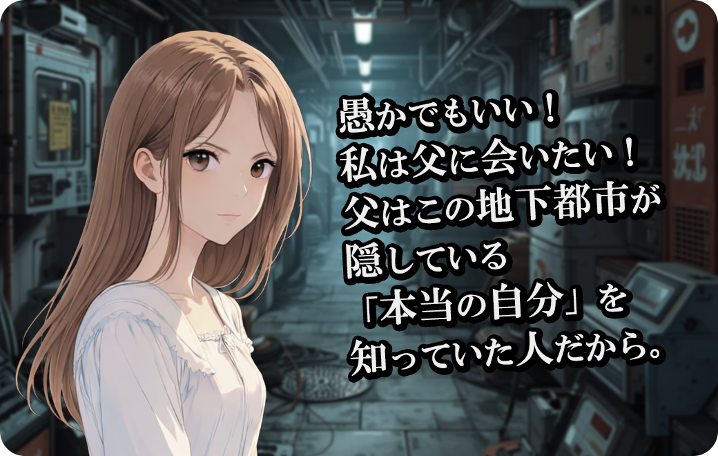 愚かでもいい! 私は父に会いたい! 父はこの地下都市が隠している「本当の自分」を知っていた人だから。