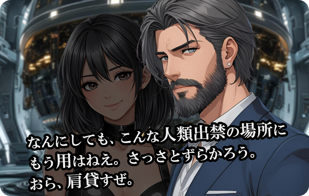 なんにしても、こんな人類出禁の場所にもう用はねえ。さっさとずらかろう。おら、肩貸すぜ。
