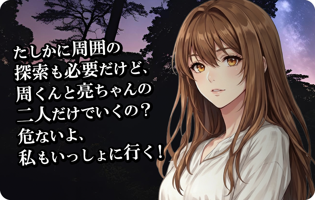 たしかに周囲の探索も必要だけど、周くんと亮ちゃんの二人だけで行くの? 危ないよ、私もいっしょに行く!