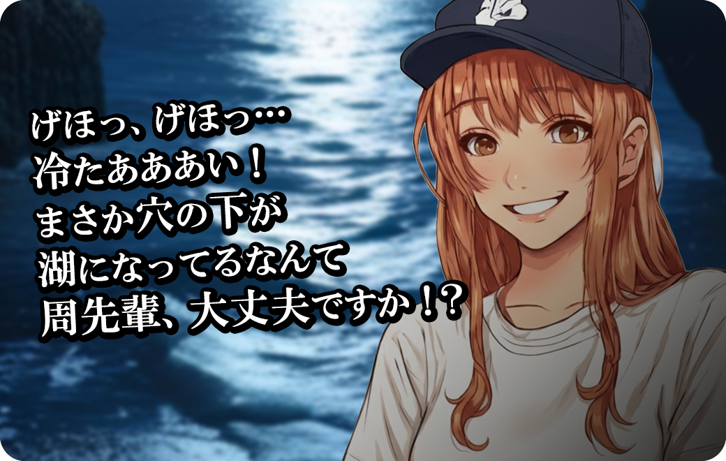 げほっ、げほっ…冷たあああい! まさか穴の下が湖になってるなんて。周先輩、大丈夫ですか!?