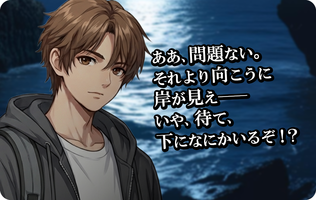 ああ、問題ない。それより向こうに岸が見え── いや、待て、下になにかいるぞ!?