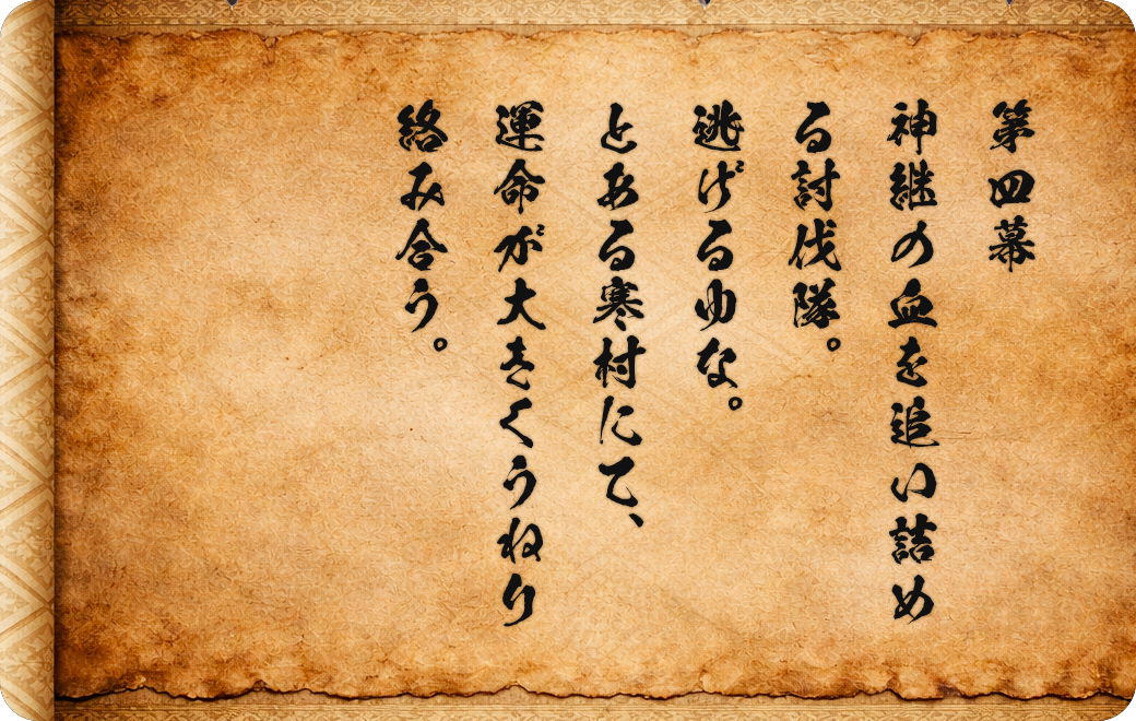 第四幕 神継の血を追い詰める討伐隊。逃げるゆな。とある寒村にて、運命が大きくうねり絡み合う。