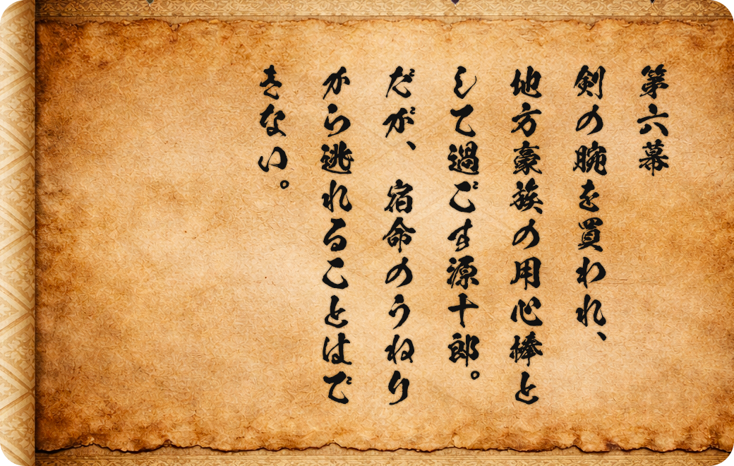 第六幕 剣の腕を買われ、地方豪族の用心棒として過ごす源十郎。だが、宿命のうねりから逃れることはできない。