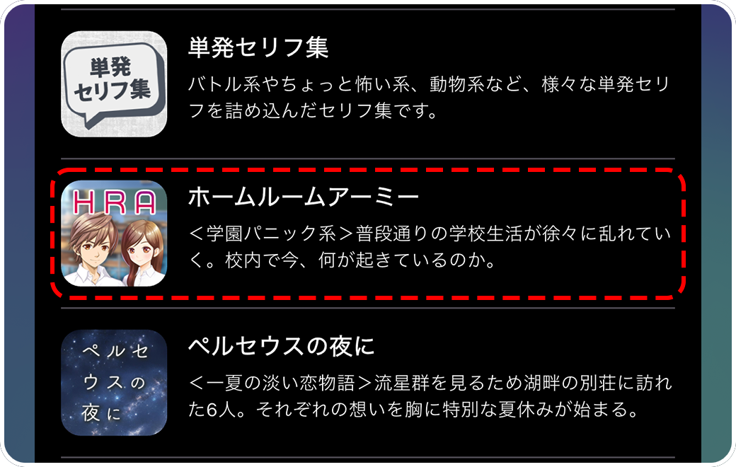 【シナリオ】は、セリフをシナリオごとで表示します。例としてホームルームアーミーを見てみましょう。