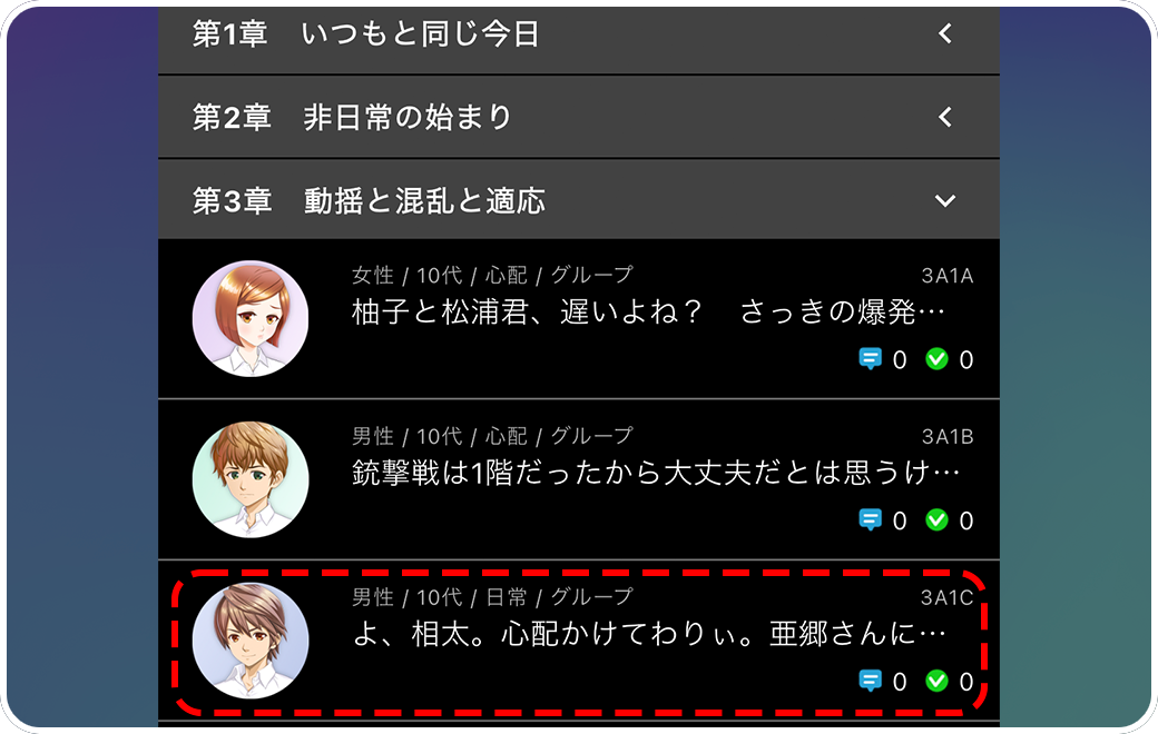 図のように章で区切られ、シナリオの時系列に沿ってセリフが表示されます。セリフの詳細を見てましょう。