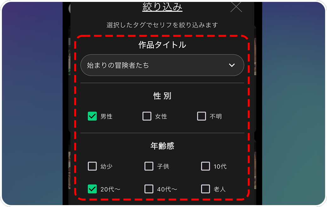 【絞り込み】は作品タイトル、性別、年齢感、カテゴリといった要素でセリフを絞り込めます。