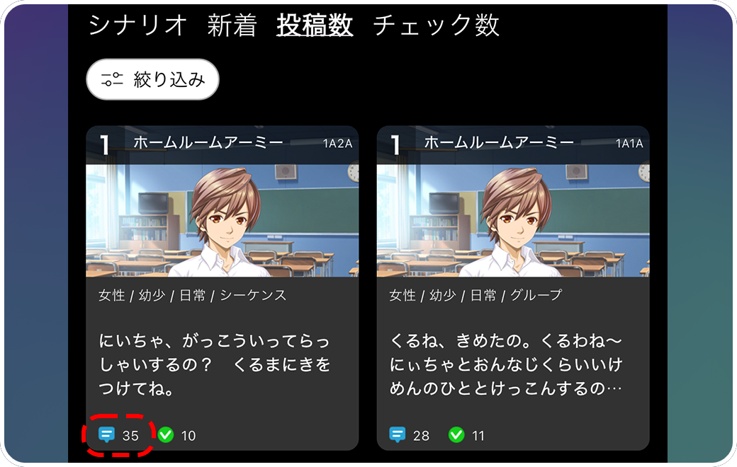 【投稿数】はアップロードされた数が多い順にセリフを並べます。水色の吹き出しが投稿数のアイコンです。