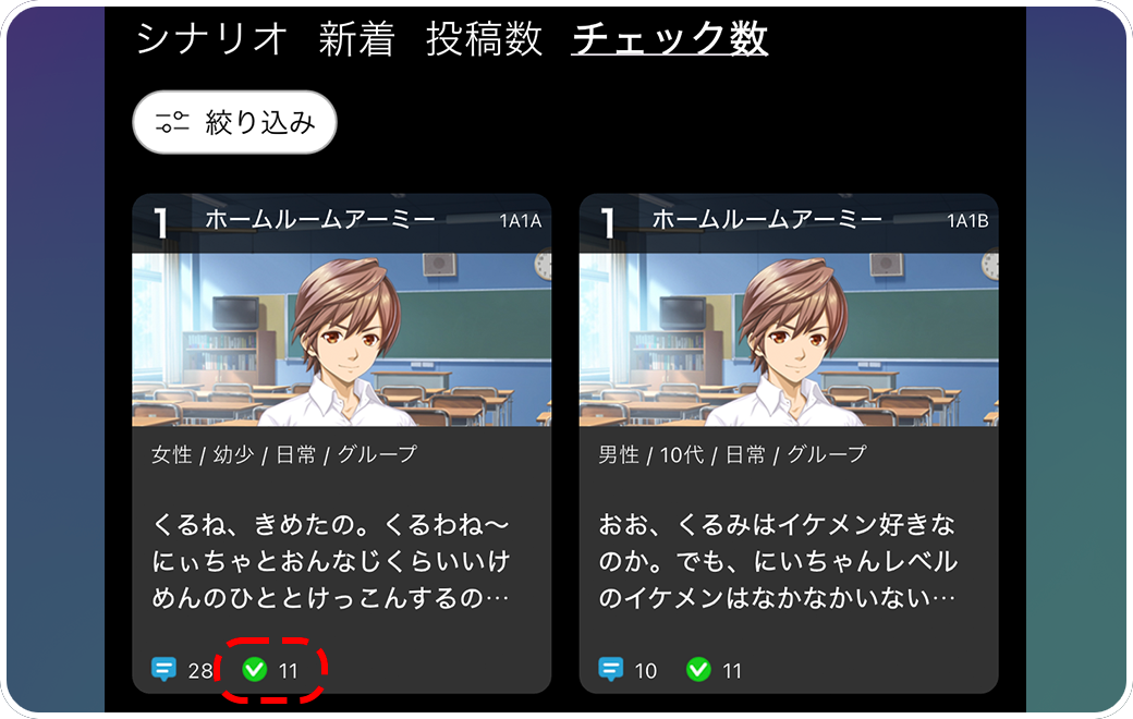 【チェック数】はチェック回数の多い順にセリフを並べます。チェックとはいわゆる「いいね」です。