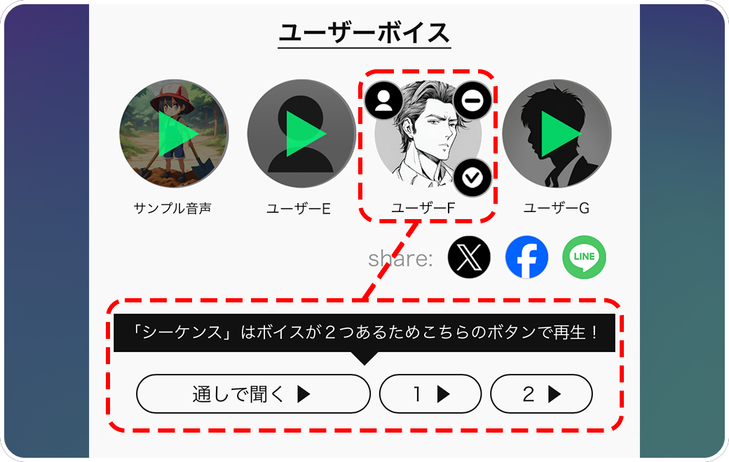 ユーザーアイコンをタップした後、画面下部の「通しで聞く」「1」「2」のボタンをタップして再生します。