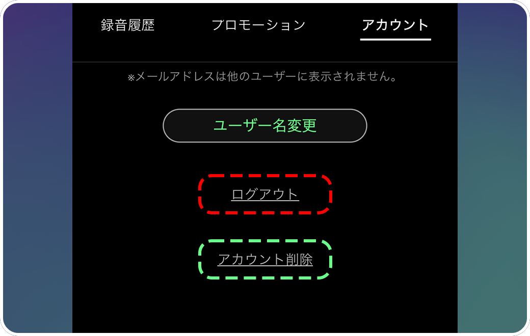 【アカウント】ログアウトをすると端末内のデータが、アカウントを削除すると全てのデータが削除されます。