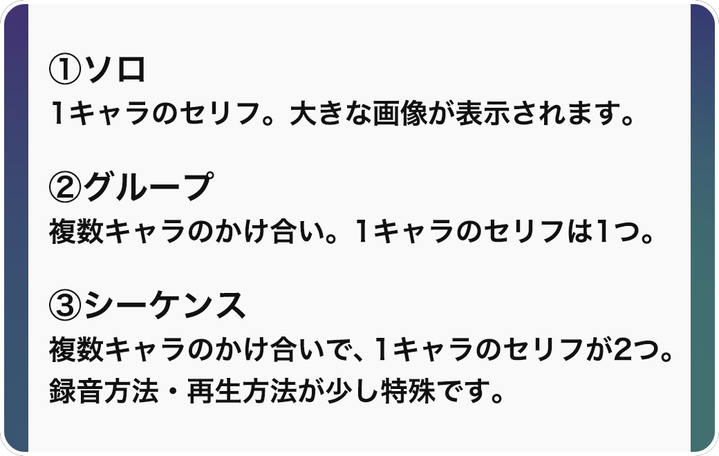 【ソロ】はこのセリフのように、セリフが1つで大きな画像が表示されるものを指します。